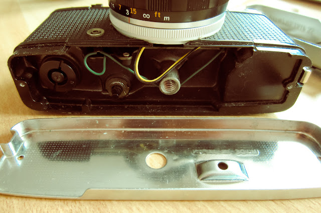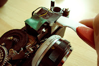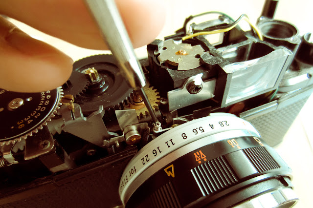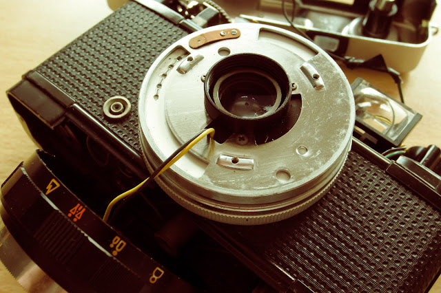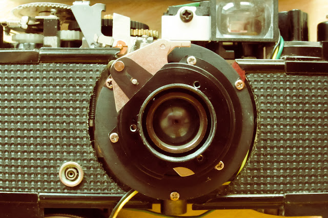 Afortunadamente nadie quiere estas máquinas y se pueden encontrar de segunda mano por prácticamente nada. Compré ésta, encontrándome con que su conocida bandera roja no aparecía por ninguna parte y el diafragma se mantenía invariable a f22. Decidí hurgar en ella a ver qué tenía dentro y esto me encontré. No pierda detalle.