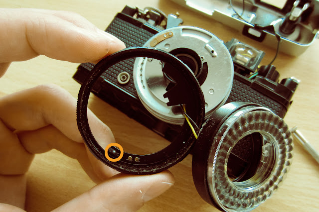 El anillo interior está unido al anillo de enfoque mediante tres pequeños tornillos. No es necesario sacarlos del todo, sólo aflojarlos.