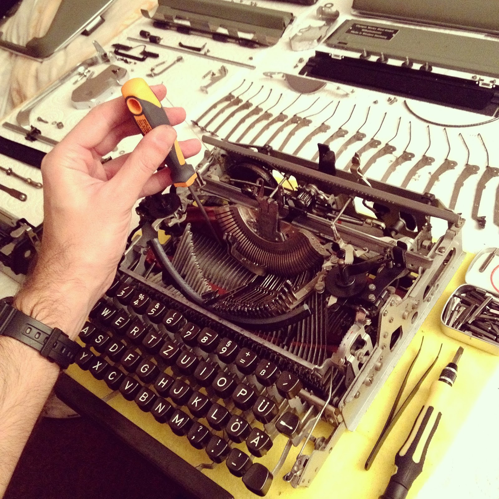I used typewriters during my childhood. However I stop using them until quite recently, when I rediscover their potential. Suddenly I saw clear the power of typewriters and I went into them in a flicker. While living in Germany I found the keyword : “Schreibmaschine“. As easy as write that in eBay and hundreds of all machines are shown. Germany has been one of the best producer and there are a lot of top brands. The prices now are worthless. I realized that when I visited a flea market in Munich and a man kept a typewriter between a certain quantity of jewel-rubbish items. I just asked the price for curiosity and he replied “5€”. 5€ even before bargain! He insisted and took it with his hands offering it to me. I had the feeling he just wanted to throw it away or even pay to someone for take it. Well, I didn´t take that, but I started to buy some other models.